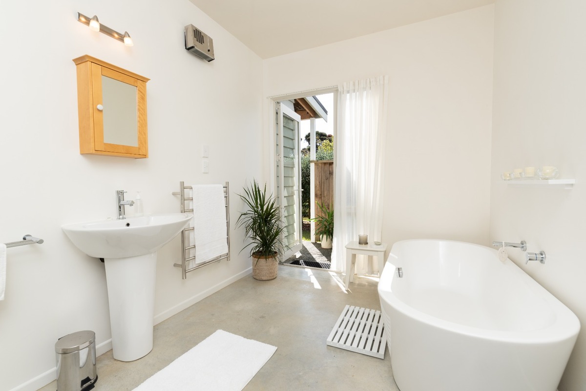 Inside, you’ll find high ceilings and polished concrete floors that give the home a modern edge while retaining warmth and character. Two generous bedrooms open directly onto the veranda, including a master with ensuite. A large separate bathroom incorporates the laundry for added convenience.