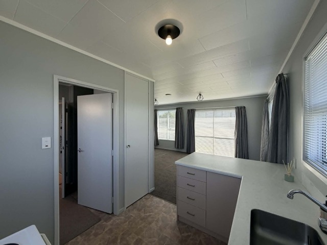 Inside is warmed by a heat pump and the main living is relatively open plan. The kitchen contains a freestanding electric oven and good cupboard storage. Adjacent is the laundry area and hot water is electric. Both bedrooms are double in size with built in wardrobes. The bathroom has an alcove shower unit and corner vanity.