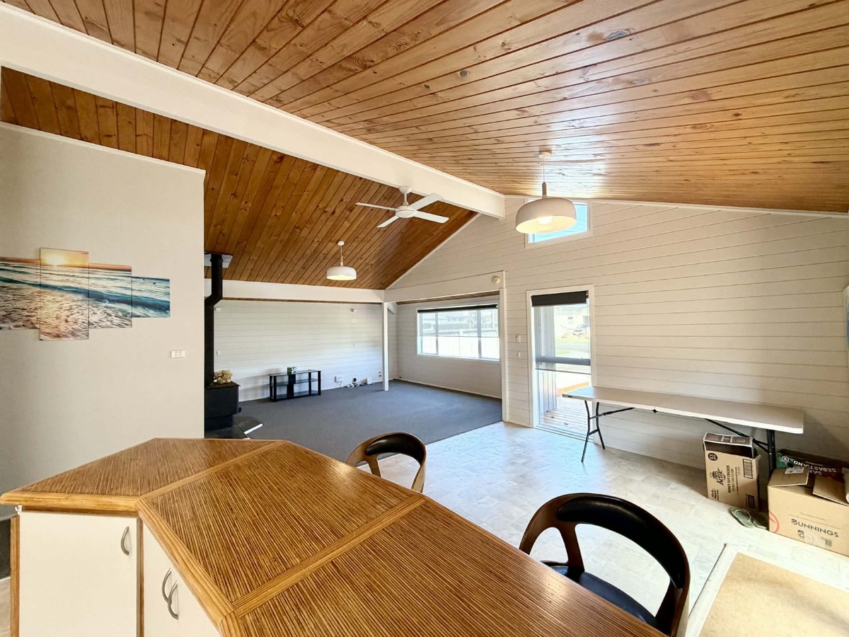 Inside the main house you’ll find three bedrooms, all with wardrobes, and one bathroom, along with a second separate toilet for added convenience. The open-plan kitchen offers ample storage and flows through to the dining and lounge area, kept cosy in the cooler months with a wood burner.