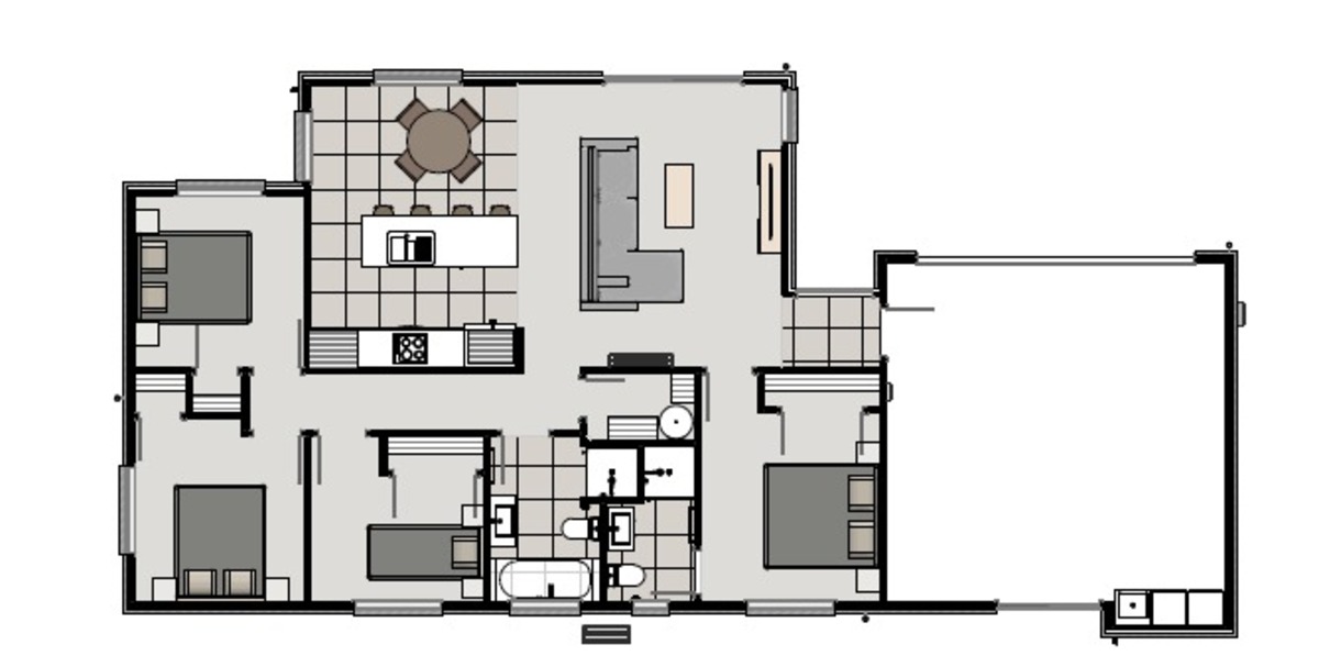 At the heart of the home is a large, open-plan living and dining area, complemented by a modern kitchen with a fresh, neutral paint scheme. The flow is practical and welcoming, perfect for everyday living and entertaining.