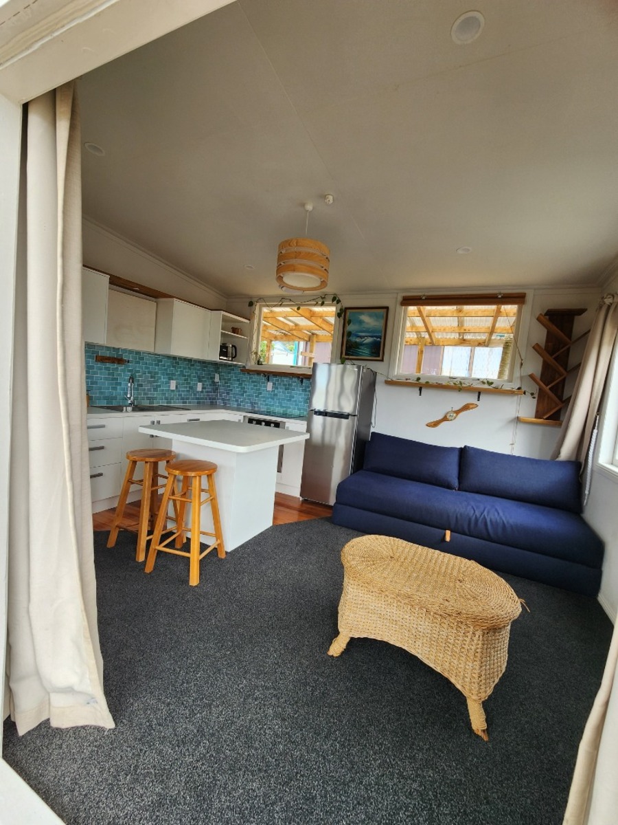 Inside, the property is modern, warm and well-presented. It features a separate bedroom with a neat ensuite bathroom, a comfortable living space with a pull-out sleeper couch, and a fully equipped kitchen. The home comes furnished, simply bring your own bedding and towels and settle in.